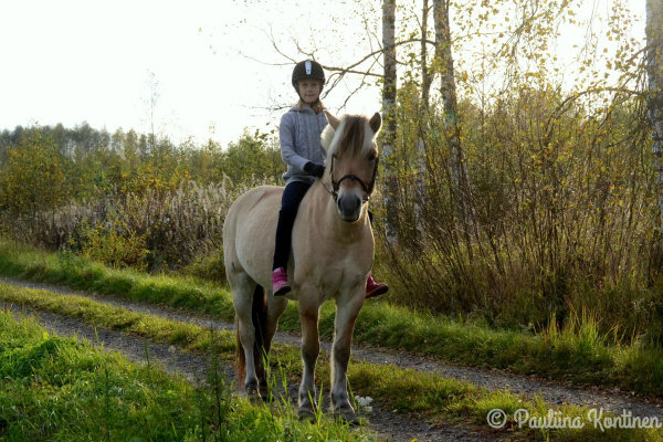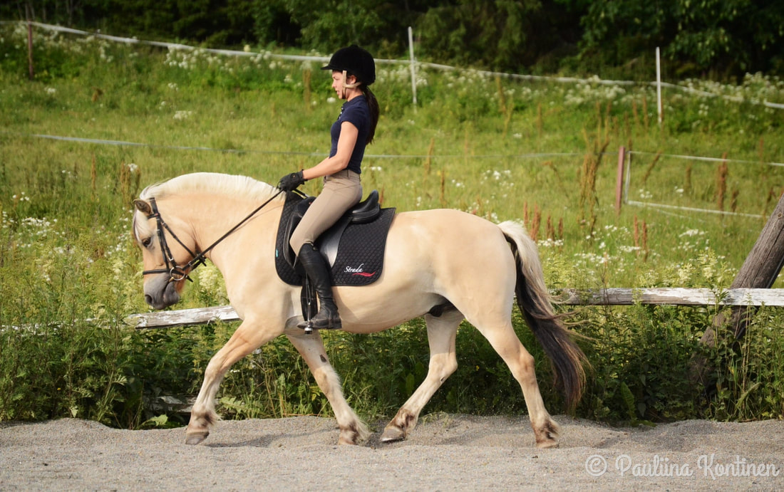Haffe on iloinen ja sosiaalinen hyvän mielen hevonen, joka ei taida tuntea käsitettä huono päivä. Se lähtee aina yhtä positiivisena mihin tahansa mukaan - sille käy kaikki. Ilman satulaa? Satulalla? Esteitä? Leikkitunti? Maastoon yksin tai porukassa? Ajamaan? Pulkka perään? Vikellyshommia? Haffe on mukana! Se on innokas tekemään kaikkea ja rohkea lähestymään uusia asioita. Ei väliä, onko tekniikka täysin hallussa, sen rehti ja reipas asenne korvaa kaiken. Ihan sama millaisen esteen sen eteen laittaa, se ainakin yrittää aina hypätä sen yli. En tiedä olenko koskaan nähnyt Haffen kieltävän, se ennemmin ottaa pitkän tai lyhyen tai vaikka puolikkaan askeleen, hyppää vinosti tai vaikka paikaltaan, mutta ei kiellä. Ja vaikka onkin innokas hyppäämään, ei se kuitenkaan kiihdyttele esteille ihan hurjana, vaan pysyy hanskassa. Kouluratsunakin Haffe on varsin toimiva. Sen vahvuus on suoruus, se on yllättävän symmetrinen molempiin suuntiin. Haasteellisinta on saada se edestä kevyeksi, sillä ruuna jää mieluusti hieman etupainoiseksi ja antaa ratsastajan kannatella itseään. Laukka vaatii hieman työstämistä, mutta kun sen saa rullaamaan, se pyörii tosi kivasti. Haffe loistaa myös WE-tehtävissä, joissa sen rauhallisuus ja rohkeus on eduksi. Myös maastoon ruuna lähtee aina yhtä halukkaasti, niin yksin kuin porukassa. Siltä ei tarvitse odottaa mitään riehaantumista ja vaikka onkin innokas, niin ei se yleensä millään lailla villiinny porukkalaukoissakaan. Haffe tosin todistettavasti osaa heittää pukin oikein innostuessaan, mutta tätä tapahtuu ehkä maksimissaan kerran vuodessa.