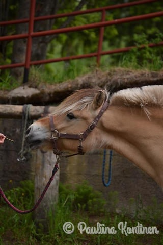 Hoitaessa Kerttu on aivan yhtä kiva kuin ratsastaessakin. Yleensä se lähtee laitumelta mukaan ihan iloisesti korvat hörössä, eikä sitä haittaa olla lasten hoidettavana ja letitettävänä. Kerttu kyllä rakastaa piehtaroimista ja kurassa olemista, joten onkin hyvä, että se kestää pidemmätkin harjausurakat hermostumatta. Myös kavioiden puhdistus, varusteiden laitto ja pesuhommat sujuvat hienosti. Kertulla ei ole sellaisia erityisen herkkiä kohtia, joihin koskeminen ärsyttäisi sitä, mutta sen sijaan sen ehdoton lempirapsutuskohta on hännänjuuri ja pepun päällinen. Erityisesti ötökkäaikoihin se oikein yrittää tarjota takapuoltaan kaikille ohi kulkeville ihmisille, että tuosta hännänjuuresta saisi mieluusti rapsuttaa - tätä ei siis pidä tulkita väärin ja kuvitella sitä uhkailueleeksi! Yksi asia saa tamman pinnan kiristymään no, hirvareiden lisäksi): että muut ovat tunnin jälkeen saaneet jo omat "energiajuomansa" ja Kerttu joutuu vielä odottelemaan omaansa. Silloin se polkee turhautuneena jalkaansa ja luo hyvin ärtyneitä katseita muihin hevosiin. Muutoinkin Kerttu on kyllä ruuastaan aika tarkka, mutta vain muita hevosia kohtaan. Ihmisille se ei koe tarvetta äksyillä, koska se kyllä tasan tietää, etteivät kaksijalkaiset kilpaile sen kanssa samoista ruuista.