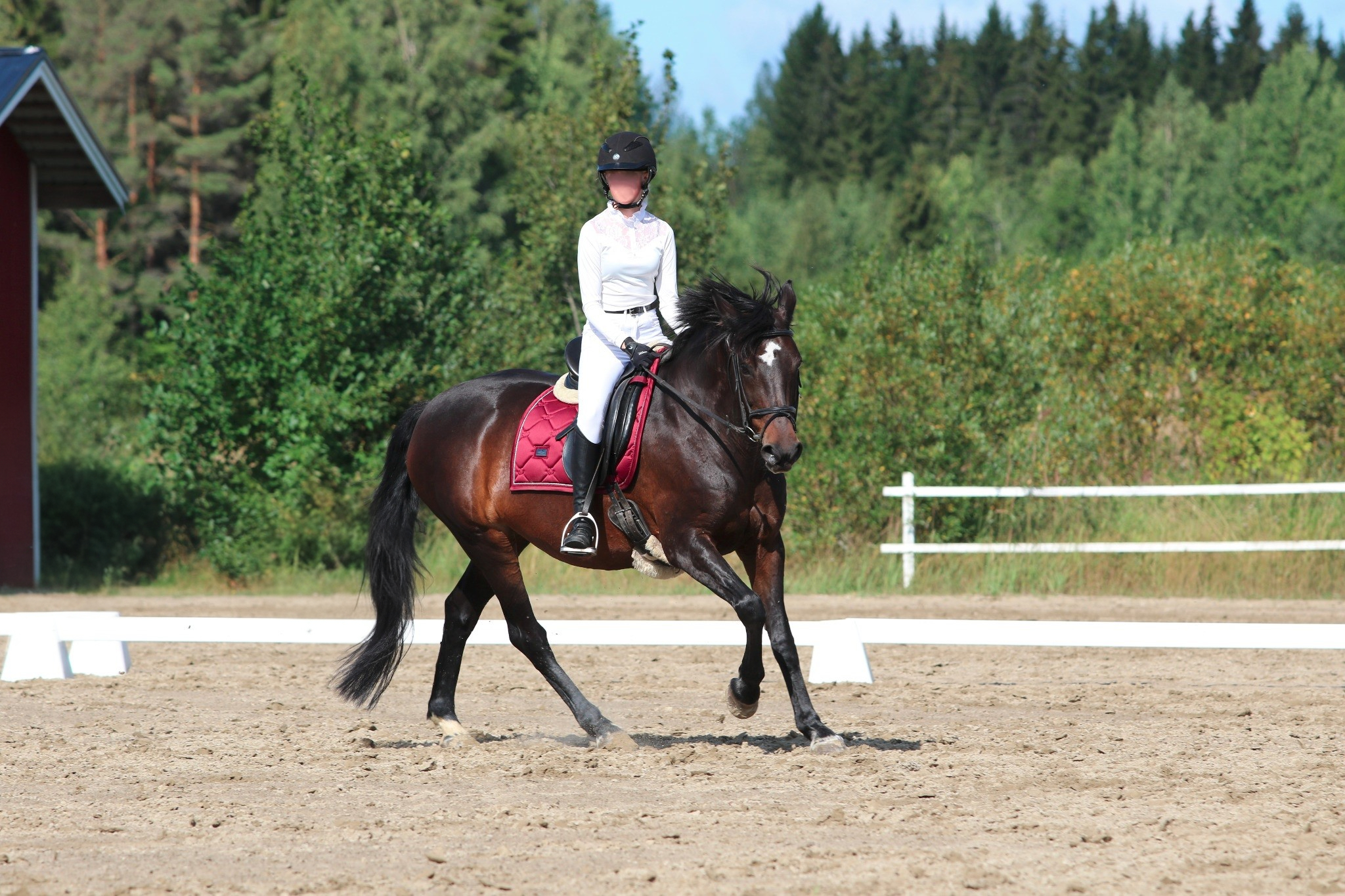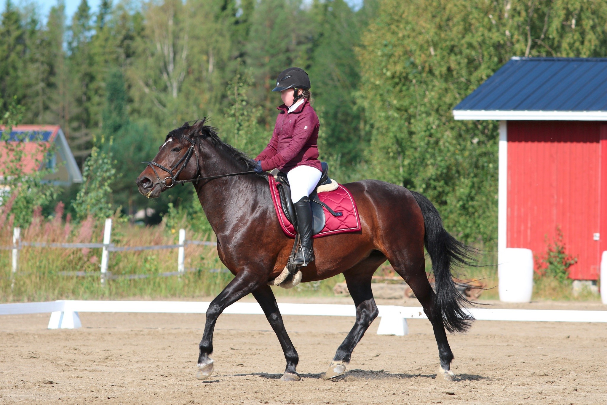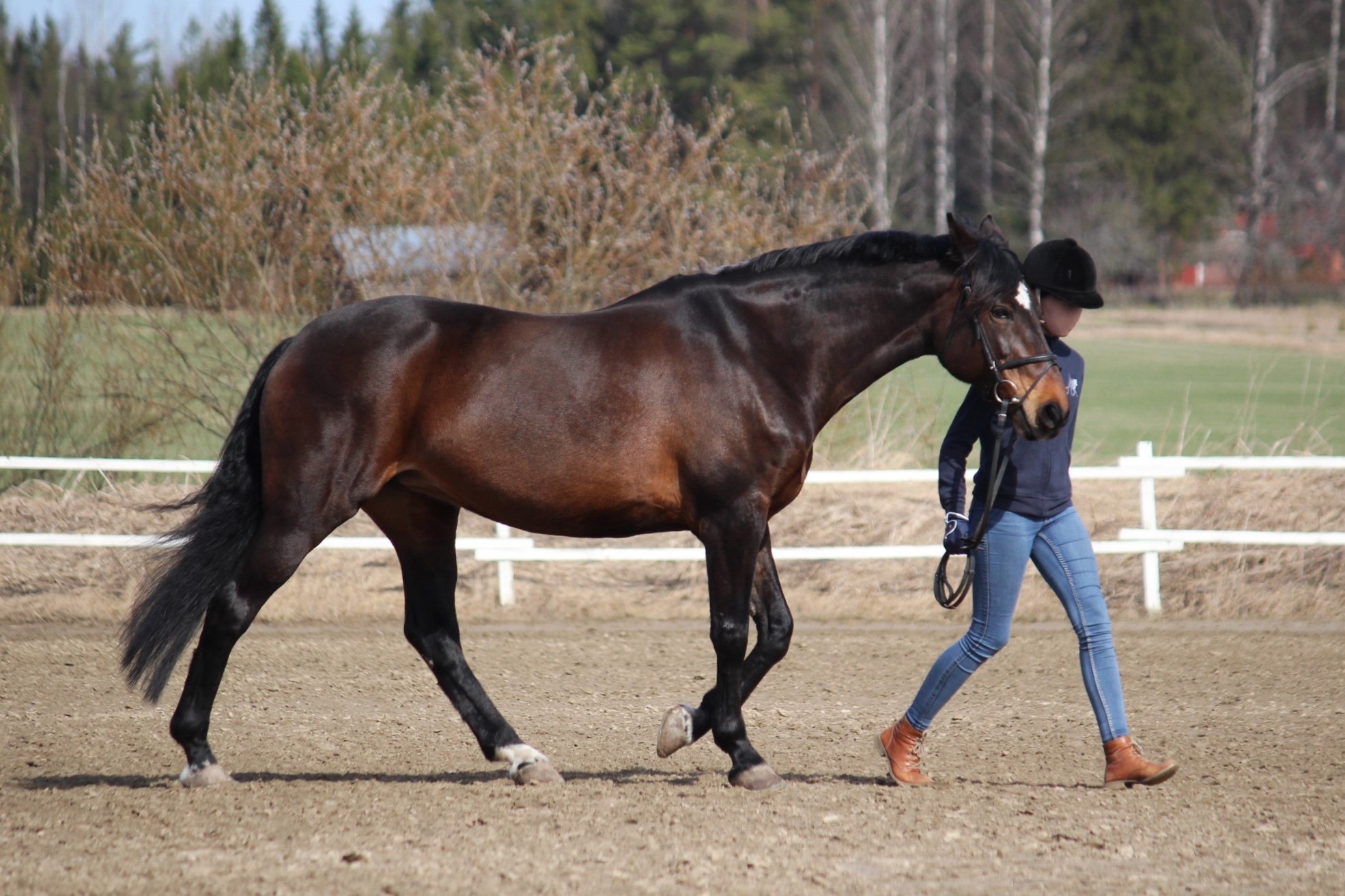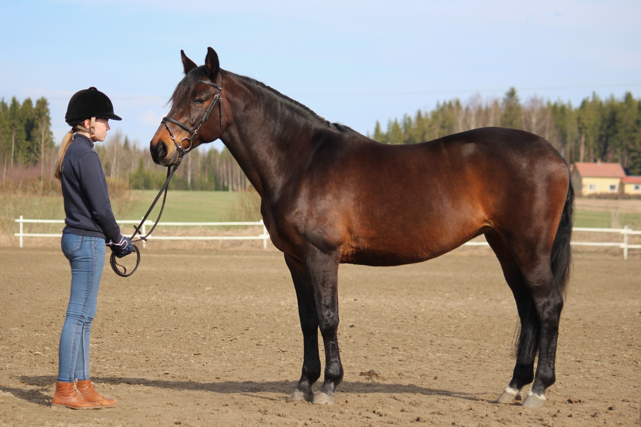 Tellu ei ole helppo, se on vaativa ratsu. Tamma ei siis sinällään tee mitään arvaamatonta, mutta se helposti kovettaa kylkensä, vastustelee tuntumaa, kulkee pitkänä ja etupainoisena tai sitten heittää päänsä ylös, selkänsä alas ja kulkee kamelina. Toisaalta tammaa ei saa painostaa liikaa, koska silloin se alkaa vastustella entistä enemmän, mutta jos siltä ei vaadi ollenkaan, se ei myöskään tee. Pitää siis osata pyytää juuri oikein, löytää tasapaino siinä, että pyytää tarpeeksi muttei liikaa - ja yhtäkkiä huomaa, että ratsu alla alkaakin toimia. Tellu on sellainen hevonen, jonka kanssa joillakin synkkaa tosi hyvin ja näillä tamma tuntuu kulkevan kuin ajatus. Meidän muiden on sitten vaan nöyrryttävä ja opeteltava, missä kohtaa ja millä intensiteetillä pyytää tai vaatia, että sieltä saa toivomansa reaktion. Tellullahan ei edes laukka nouse, ellei ratsastaja pyydä sitä sillä tavalla kuin Tellu tahtoo. Ilman ulkopohjetta laukka ei nouse ollenkaan, mutta sisäpohkeella ja -polvella ei myöskään saa jäädä puristamaan. Onneksi Tellun reaktiot sen mielestä vääränlaiseen ratsastukseen ovat kuitenkin ratsastajan kannalta vaarattomia, joskin toki turhauttavia. Tamma ei siis kuitenkaan yritä päästä ratsastajastaan eroon. Ja kun sen kanssa löytää sellaisen yhteisen sävelen, Tellu on oikeasti varsin kiva, tasaisesti suorittava kouluratsu - kunhan välillä vaan muistaa tsekata, että tamma reagoi edelleen eteen, eikä jää vähän hitaaksi. Esteillä hevonen on jonkin verran helpompi ja ehkä eniten sen kanssa saa kiinnittää huomiota reitteihin, jotta Tellu ei oikoisi niitä. Välillä pitää myös esteiden välissä muistaa ratsastaa vähän eteen. Maastossa tamma sitten taas kulkee kivasti melkein kellä tahansa, eikä yllättäen enää olekaan ollenkaan niin vaativa. Sen kanssa voi yhtä lailla lähteä pitkin ohjin kävelylle kuin tehdä porukalla reippaampi maasto ja Tellu on aika mutkaton menijä. Laukatkin maastossa nousevat ihan eri tavalla, viimeistään muiden esimerkistä. Ainakaan Tellu ei villiinny maastossa ja harvoin se jaksaa kauheasti pelätä tai ihmetellä mitään.